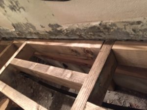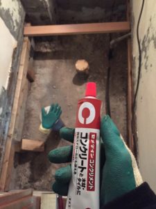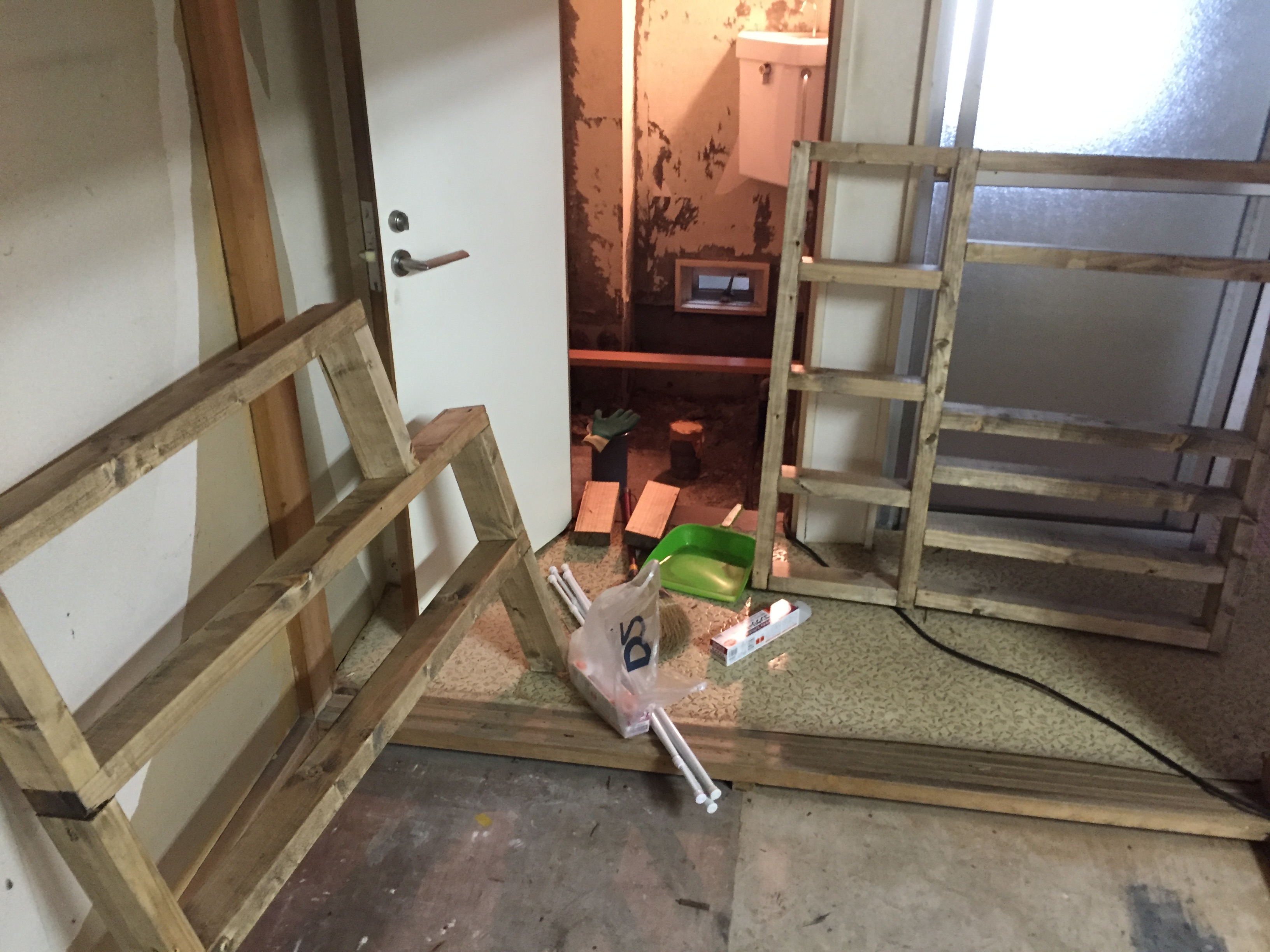 この日の作業は腐食剤の塗装も終えたトイレの土台取り付け準備です。