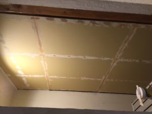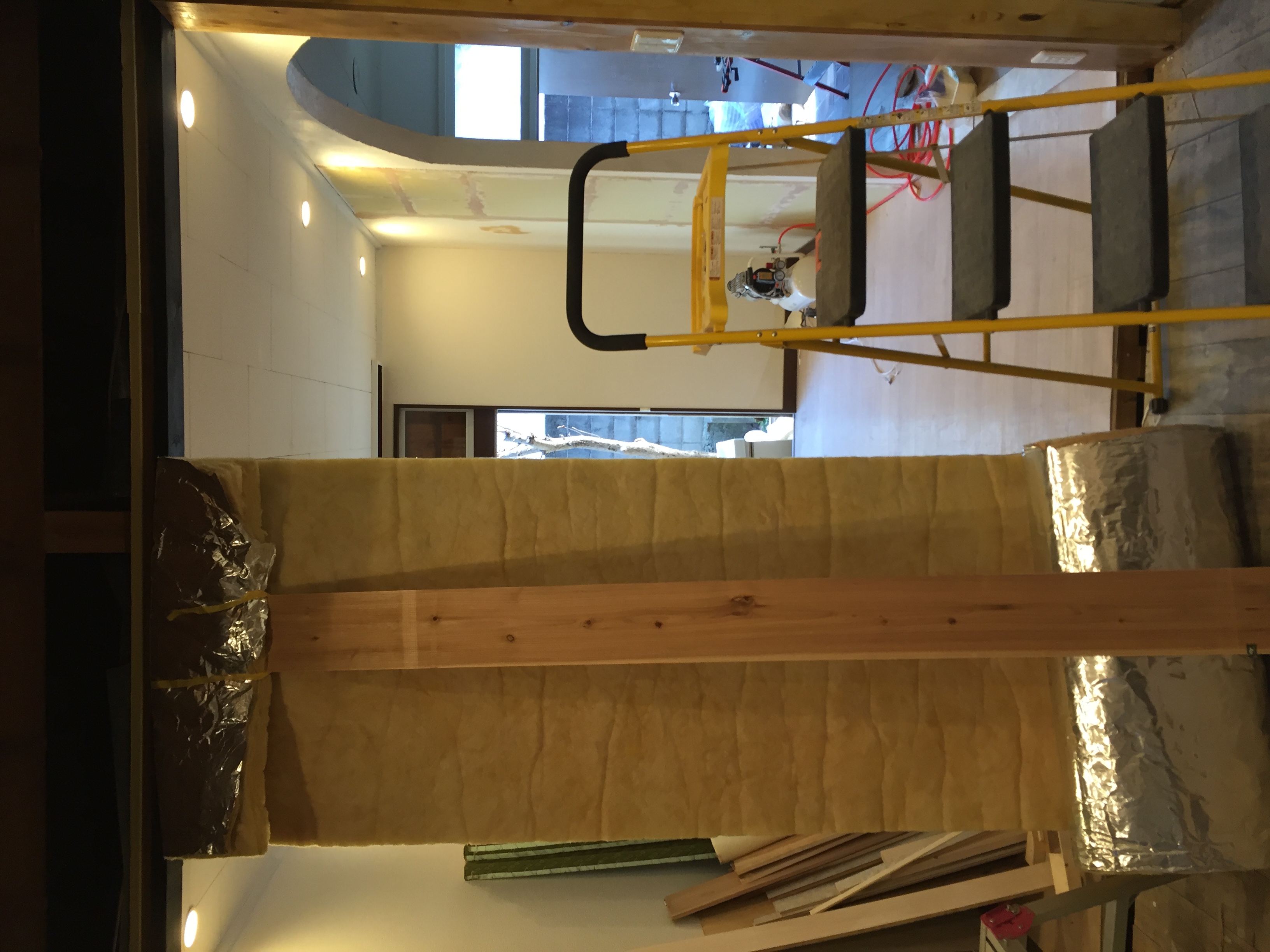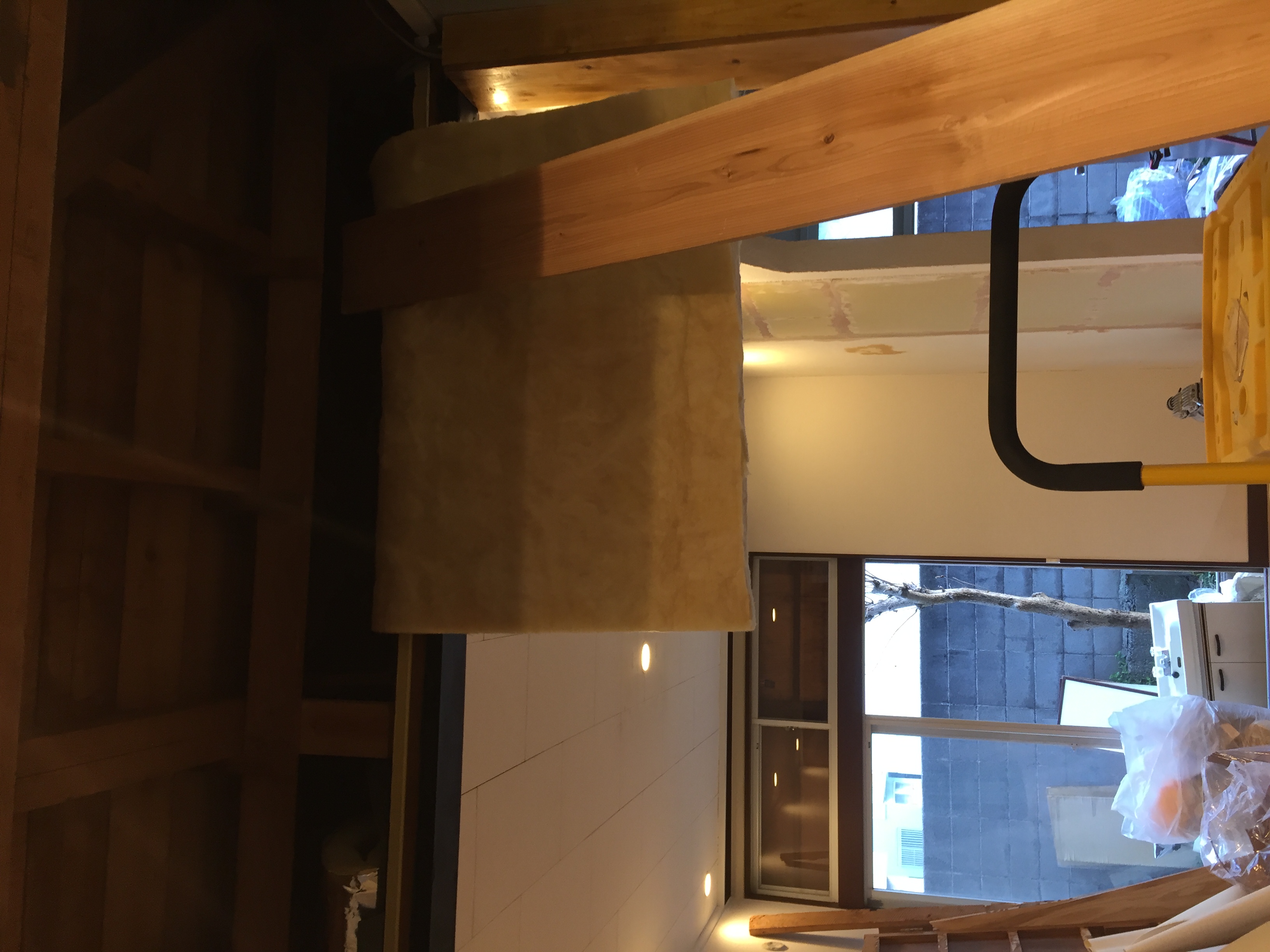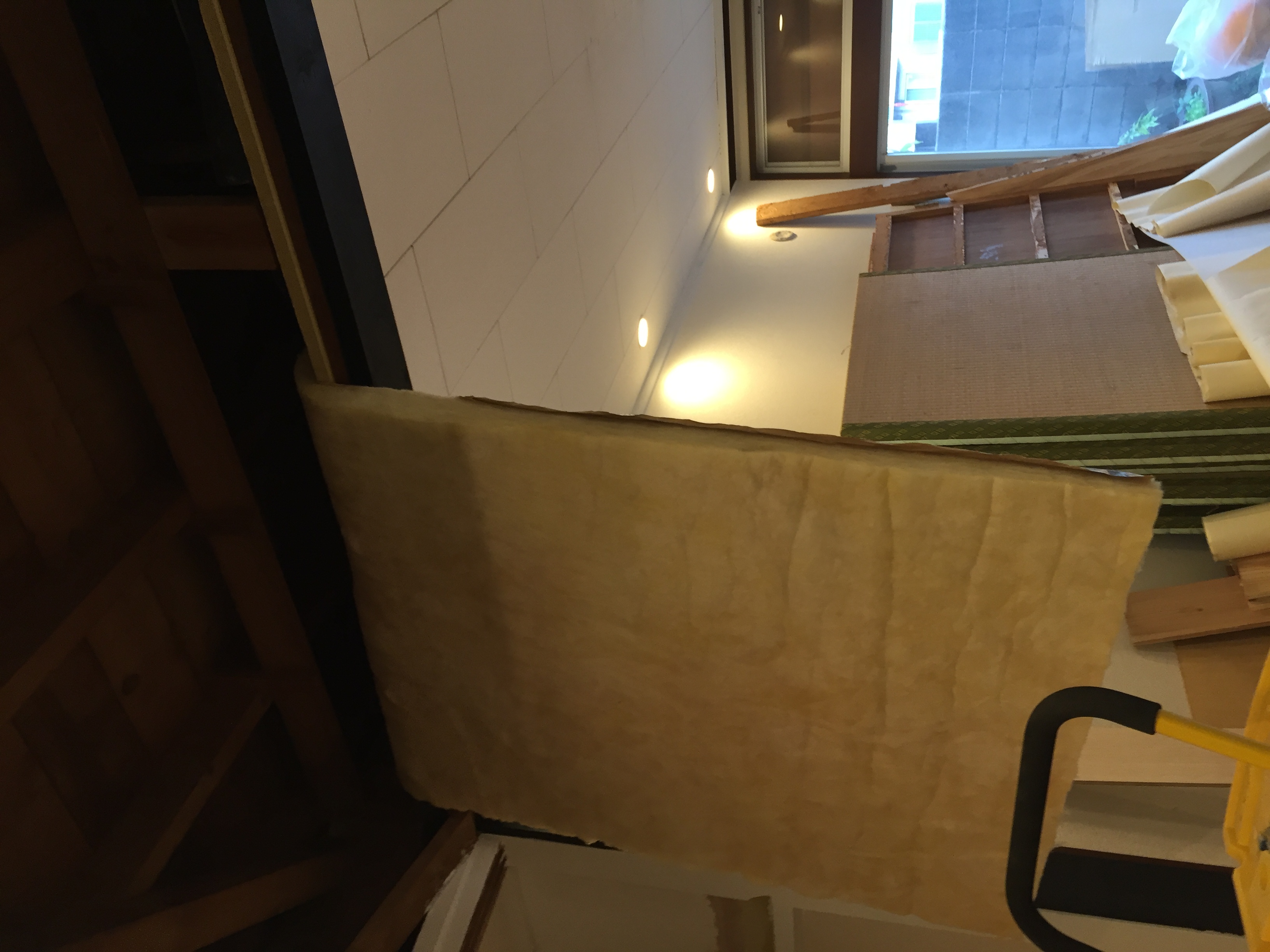 お次は一階、洋室の天井裏に寝室との防音効果を高めるため、以前に遮音シートを敷いた上に更にグラスウールを敷きます。