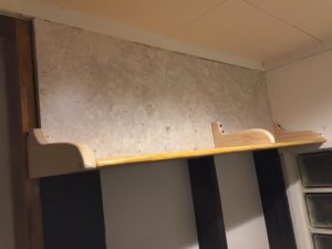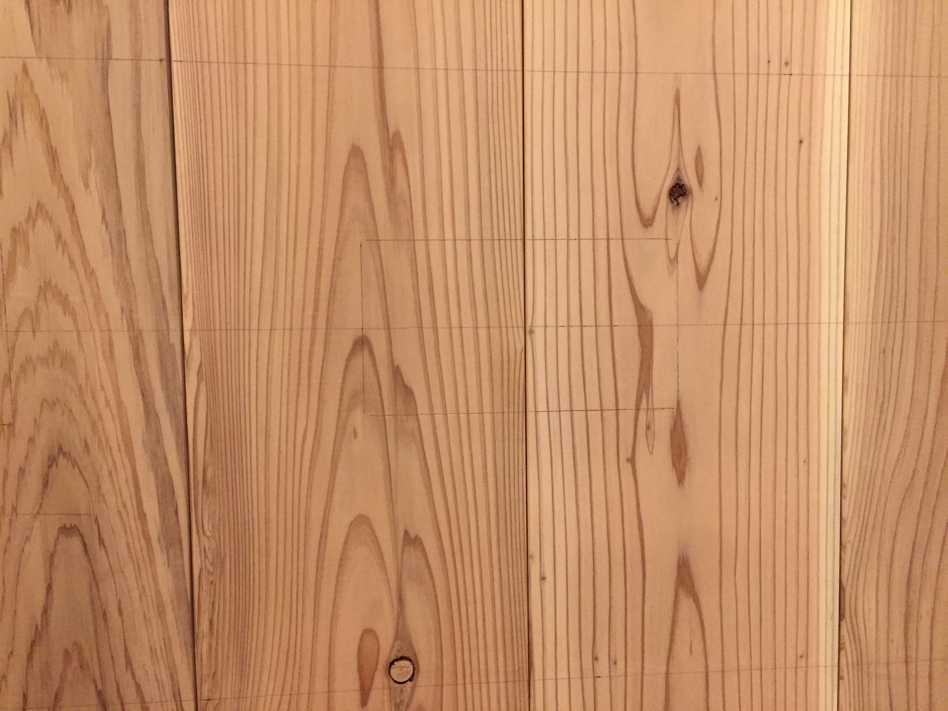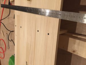 次に、見辛いですがラック背面の無垢材にラックの高さに合わせた穴を空け位置にケガキを入れます。